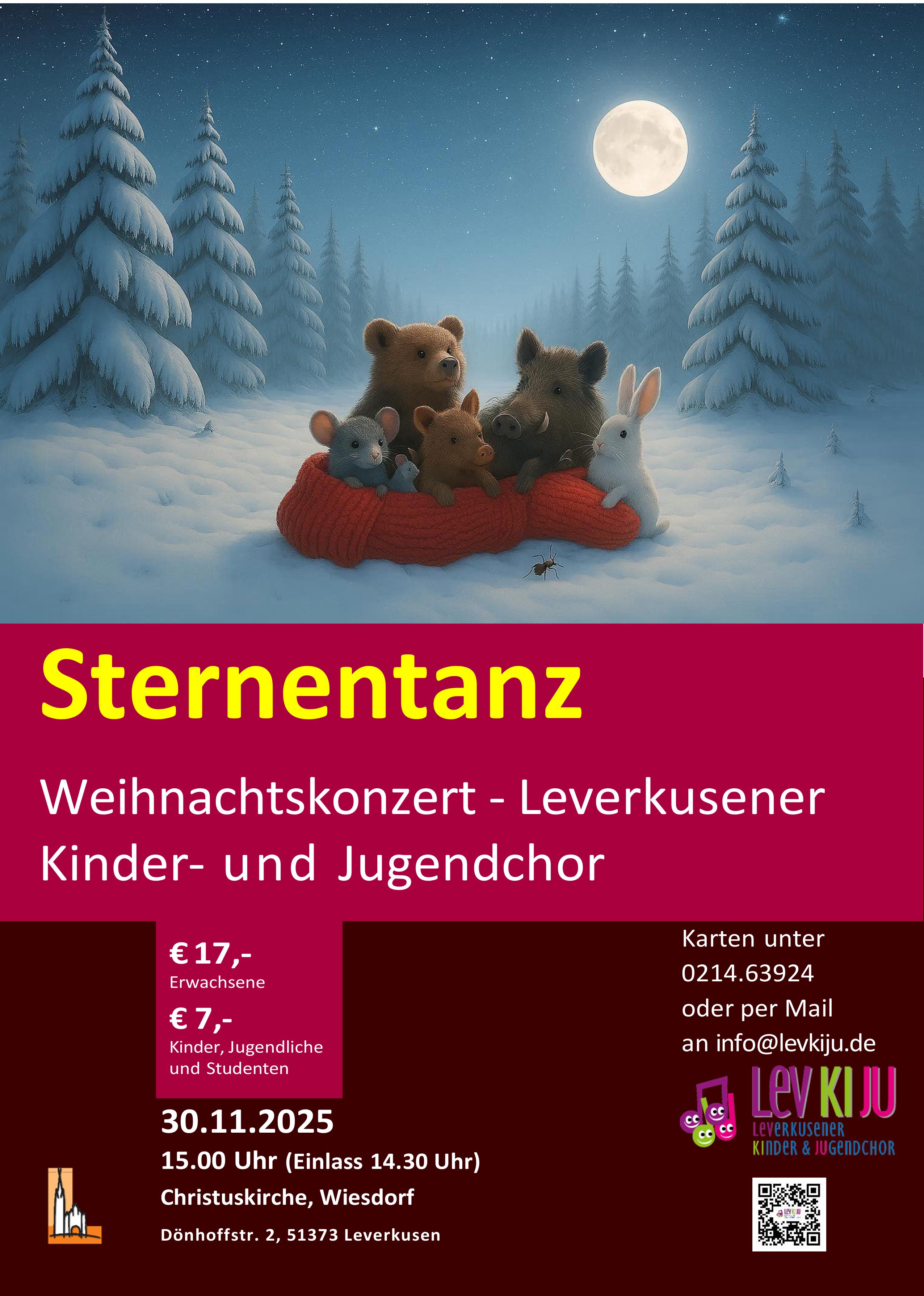 Am 30. November 2025 um 15.00 Uhr laden wir herzlich zu unserem Weihnachtskonzert „Sternentanz“ in die Christuskirche Leverkusen-Wiesdorf ein.